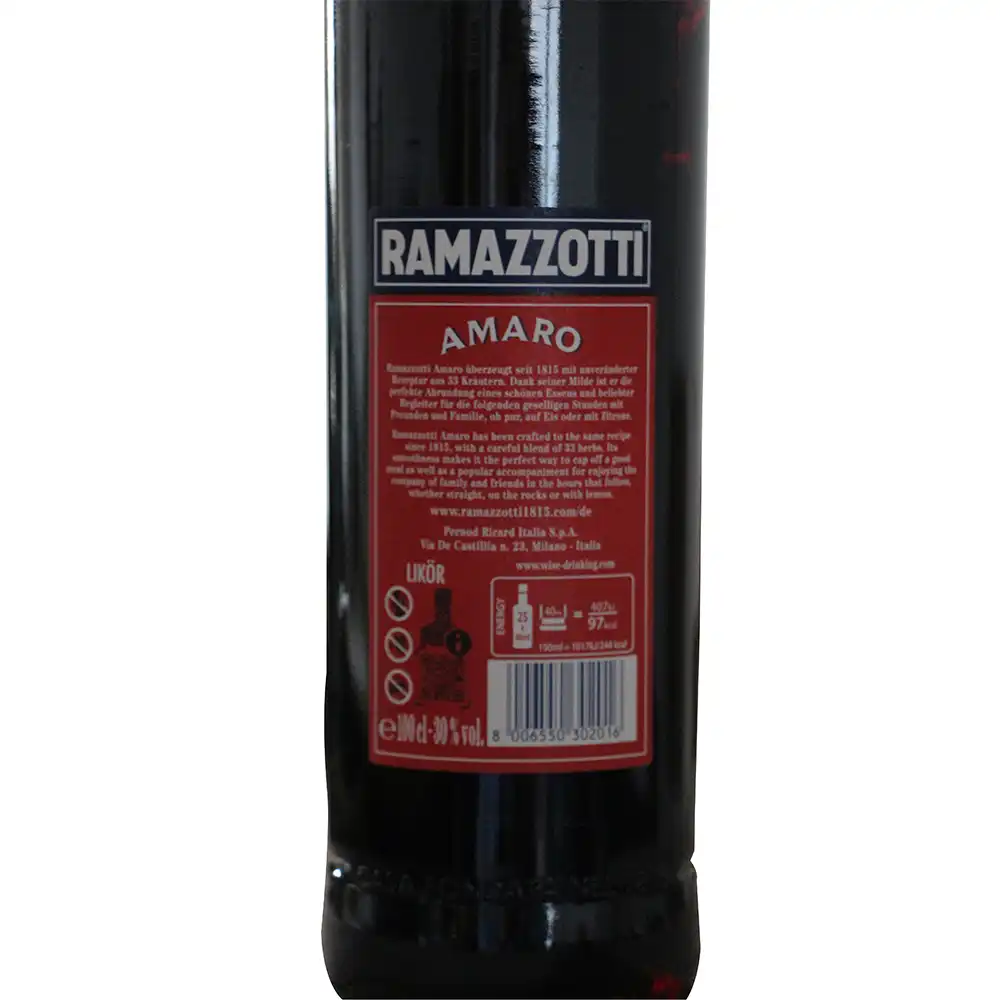 Ramazzotti Amaro 1.0 Liter und 30 % Vol. wird von der Firma Fratelli Ramazzotti S.p.A. hergestellt. Das Unternehmen wurde im Jahr 1815 in Mailand, Italien, gegründet und ist seitdem für die Produktion des beliebten Kräuterlikörs verantwortlich. Fratelli Ramazzotti S.p.A. hat im Laufe der Jahre seine Rezeptur und Herstellungstechniken weiterentwickelt, um den einzigartigen Geschmack und die Qualität des Ramazzotti Amaro zu gewährleisten. Abgefüllt ist er in einer 1,0 Liter Flasche mit 30 % Vol.