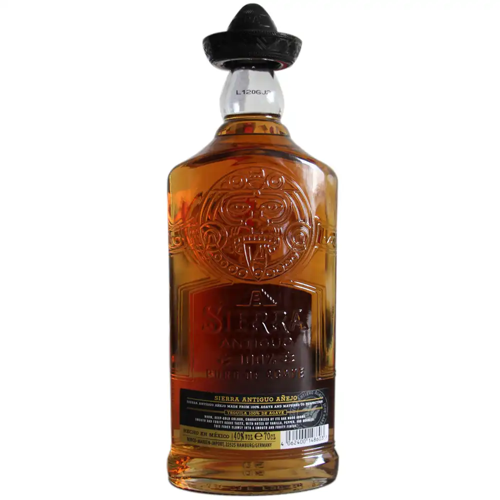 Der Sierra Antiguo Tequila Anejo mit 700 ml und 40 % Volumen ist ein 100 Prozent Agaven Tequila, gereift im Eichenfass. Der braune Tequila Sierra Antiguo Anejo präsentiert sich in einem warmen Goldton. Vollmundig, mild und fein im Geschmack bringt er ein einmaliges Aroma zum Vorschein. Vanille, Orange, Nelken und Pfeffer stehen in gelungener Harmonie zueinander. Mit einem fruchtigen und intensiven Nachklang verhallt der Sierra Anejo langsam. Zum puren Genuss empfehlen wir, den goldenen Antiguo Tequila Anejo in ein großes Cognacglas zu gießen. Handwarm kommt er am besten zur Geltung. In Bars wird der Anejo gerne für Premium-Cocktails verwendet.